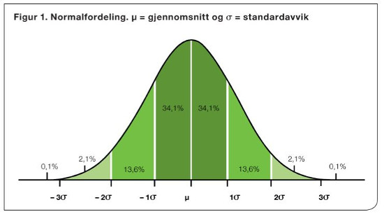 Størrelsen på variasjonen til en normalfordeling uttrykkes ofte i standardavvik (kvadratroten av variasjonen). For hvilken som helst normalfordeling, uavhengig av art og egenskap, vil et standardavvik på hver side av gjennomsnittet tilsammen omfatte ca. 68 % av verdiene, to standardavvik vil omfatte ca. 95 % av verdiene og tre standardavvik 99% (Figur 1). For eksempel hvis det fenotypiske gjennomsnittet for melkemengde er 7 000 kg og standardavviket er 1 000 kg, så vil 68 % av fenotypene være mellom 6 000 og 8 000 kg og 99 % være mellom 4 000 og 10 000 kg.
