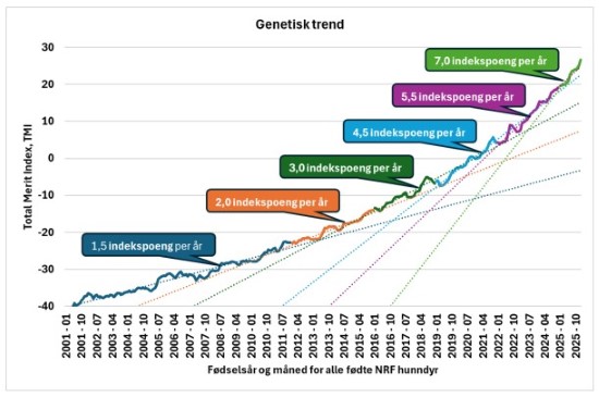 Avlsframgangen hos NRF har aldri vært høyere enn den er nå. I 2023 nådde vi en økning på 6 indekspoeng/år.